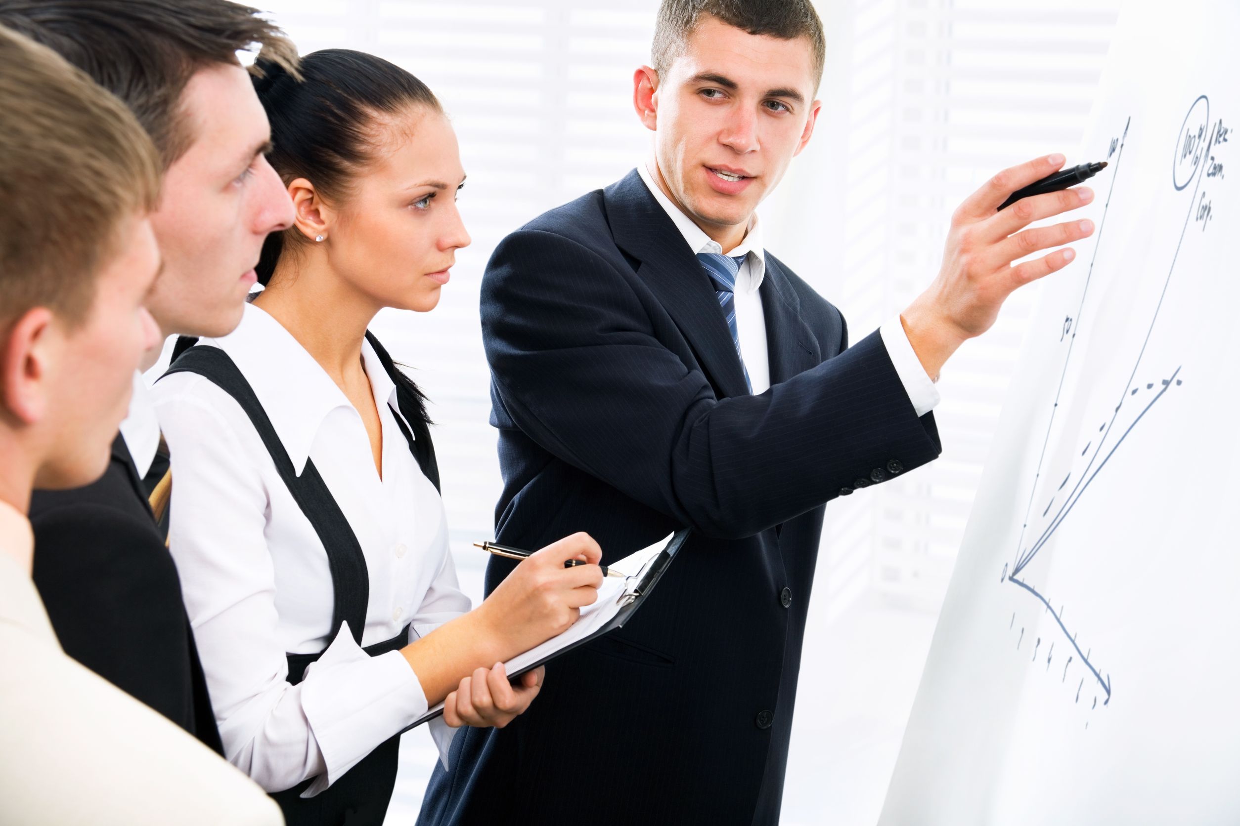 12509243 – young businessman presenting his ideas on whiteboard to colleagues